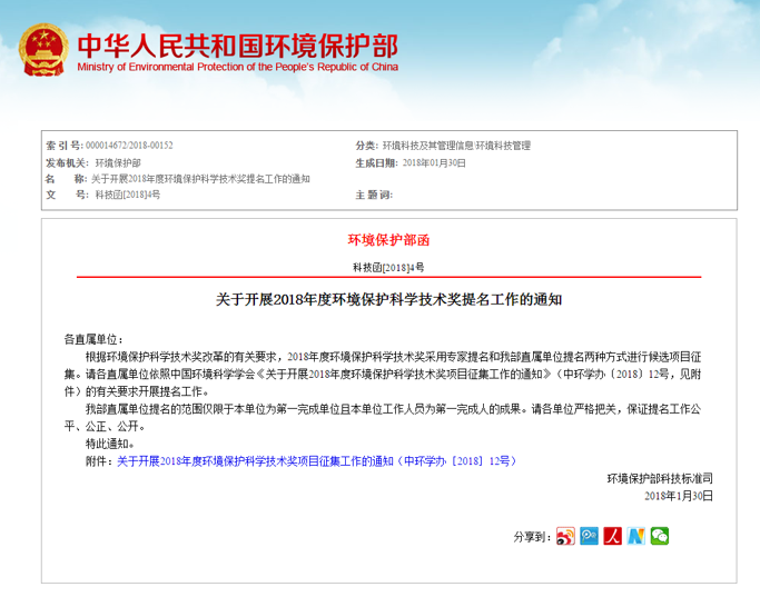 河北誠譽環(huán)境工程有限公司獲悉,2018年度環(huán)境保護科學(xué)技術(shù)獎項目征集工作正式啟動,網(wǎng)上申報截止日期為2018年5月31日17:00,書面材料報送截止日期為2018年6月15日(以郵寄日期為準)詳情如下: ..