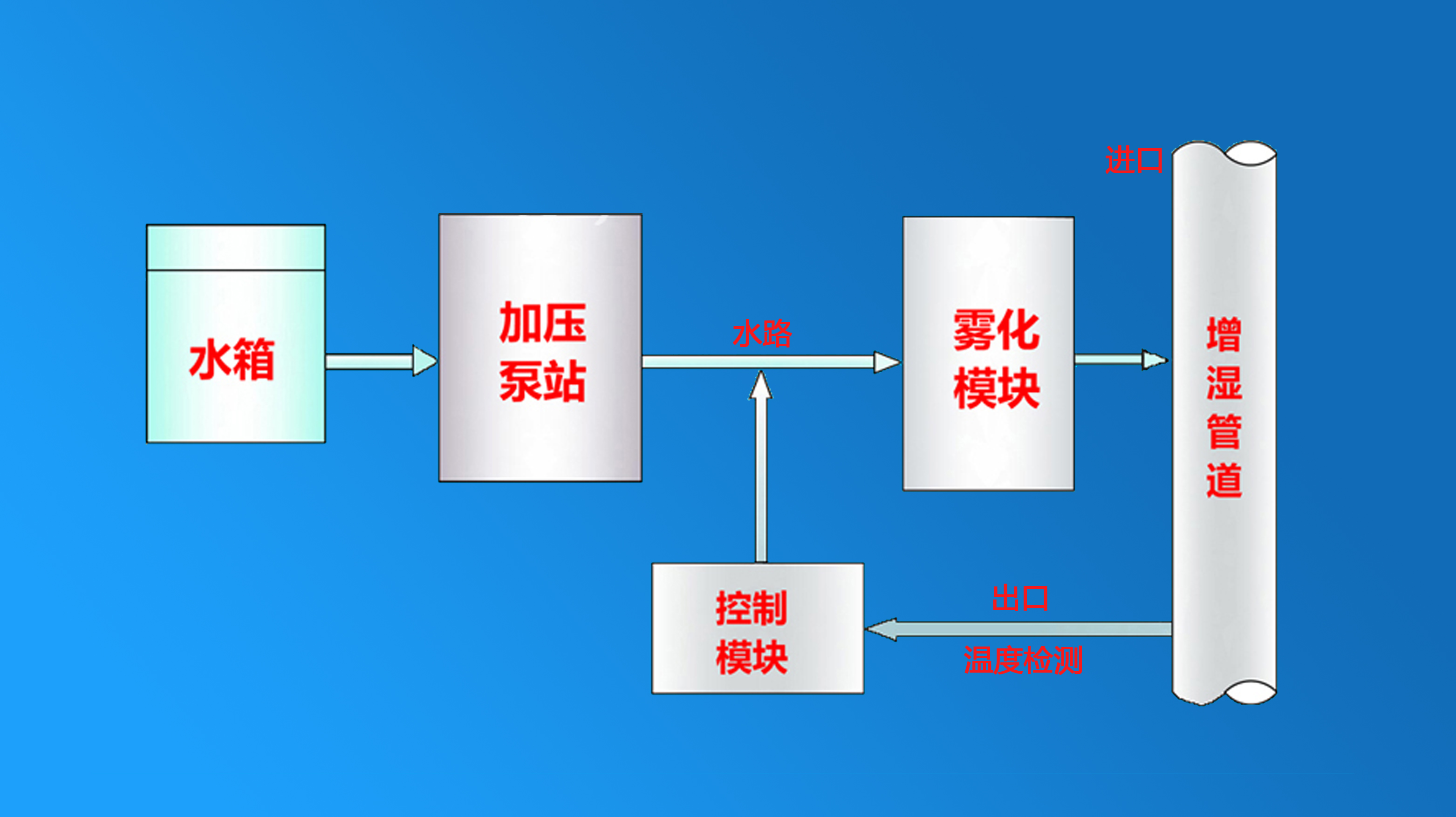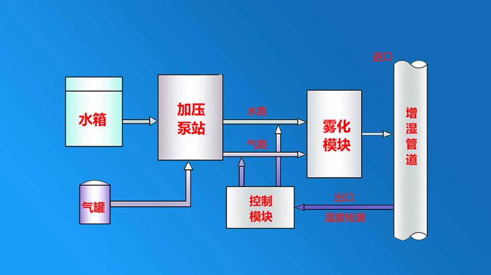 系統(tǒng)結構:該系統(tǒng)霧化噴槍固定在增濕塔錐體部位,整套設備由四部分構成:一是壓縮空氣供應系統(tǒng),與主排風機相連接;二是加壓供水系統(tǒng)。由立式多級離心泵帶電機和整套精密低壓閥門、過濾器等附件組成;三是增濕塔頂部霧化系統(tǒng)。由增濕塔頂部環(huán)管、噴槍、噴嘴、高壓伸縮軟管及精密閥門、過濾器等連接件組成。四是多功能控制系統(tǒng)。由氣、水壓力、溫度、流量測控器,低壓元器件和變頻器等組成完整閉路控制系統(tǒng)。